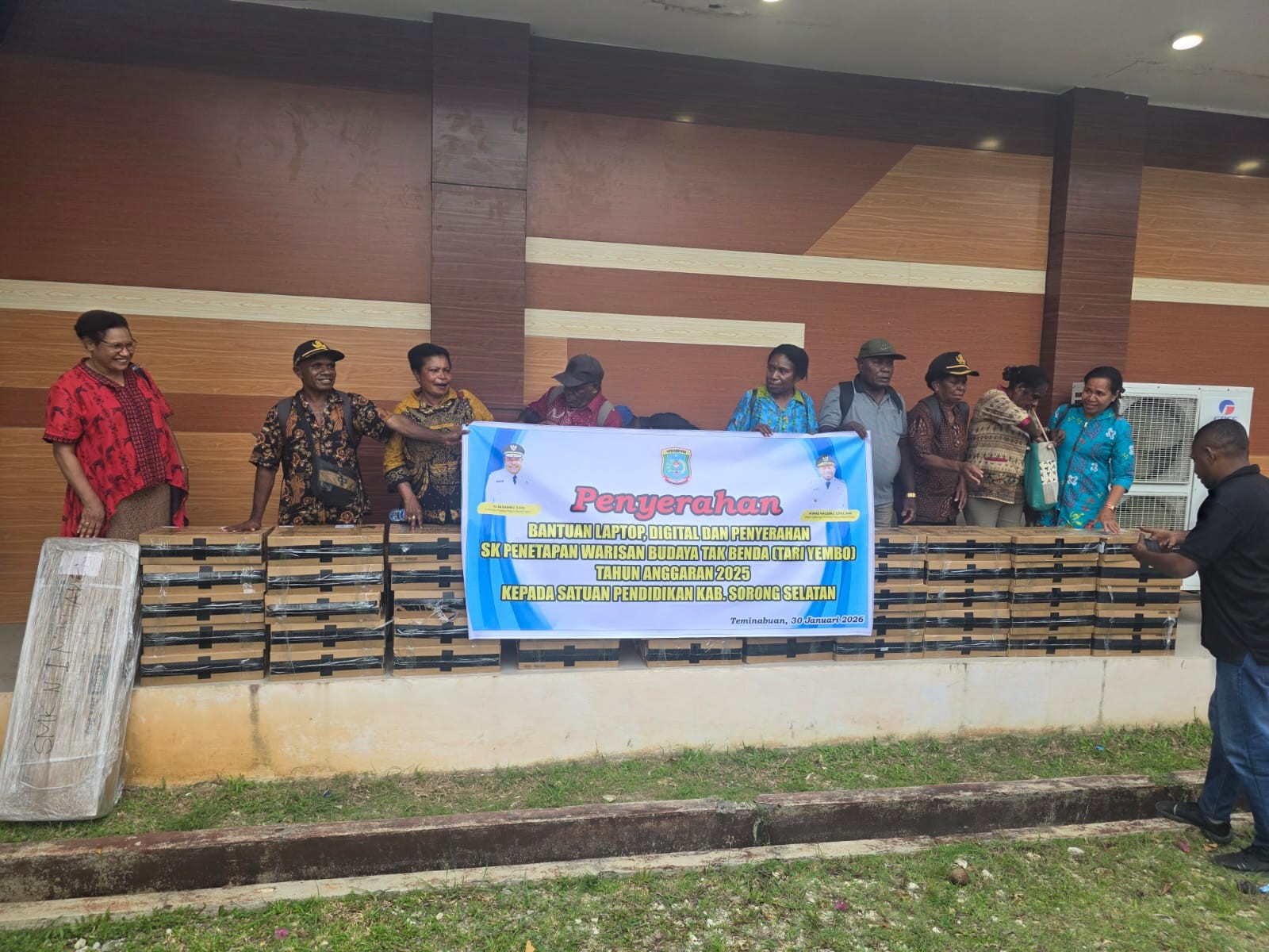 Teminabuan, Kabupaten Sorong Selatan, Provinsi Papua Barat Daya – Gubernur Papua Barat Daya, Elisa Kambu, S.Sos, melakukan kunjungan kerja di Kabupaten Sorong Selatan dalam rangka penguatan sektor pendidikan dan pelestarian identitas kebudayaan daerah. Bertempat di Hotel Mratuwa, Teminabuan, Gubernur menyerahkan langsung bantuan berupa 50 unit laptop, 1 unit alat digital, serta SK Penetapan Warisan Budaya Tak Benda (WBTB) Nasional yang berasal dari Kabupaten Sorong Selatan, Provinsi Papua Barat Daya, Jumat (30/1/2026).